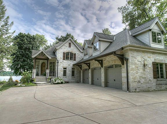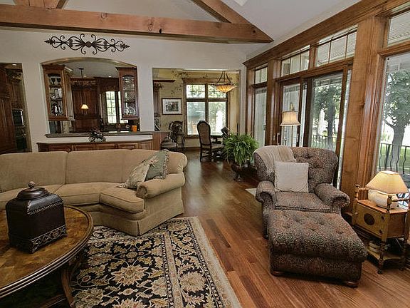 Stunning Old World Custom French Country Southern Exposure, Sand Frontage. Enter thru the massive arched African Walnut door. Attention to detail & high end appointments throughout. Burmeister Cabinetry/millwork. Rich Santos Mahogany heated floors on main. Beamed LR w/custom stone fireplace. KIT has elegant cherry cabinets & granite. Master Suite w/tumbled marble, polished nickel, clawfoot tub in 2nd BA. LL walkout, w/travertine, custom stone NFP, Wet Bar RM, Pool Table RM, 3rd BR suite, office, 4th BR, Bonus RM, 3.5 attached garage.