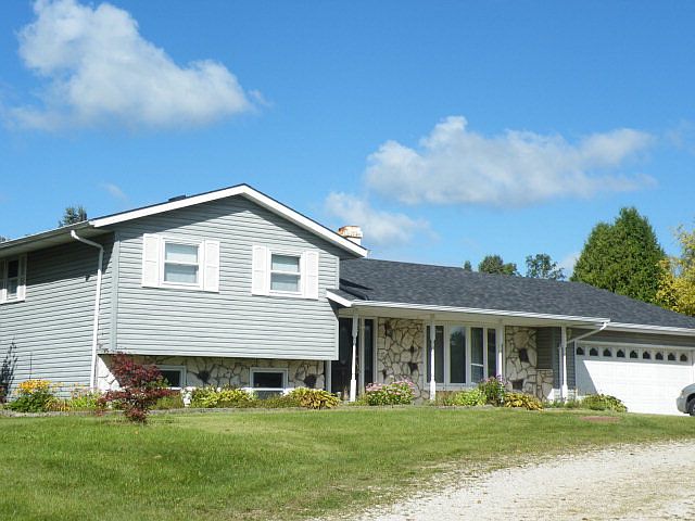 REDUCED PRICE!Great Country Home located on quiet road. (Maple Road) This spacious 3 bedroom, 2 full bath home has a mix of laminate, carpeted and vinyl flooring throughout living areas. A great room with walk out from lower level with a gas fireplace. The mechanical room has both a gas furnace with central air and a forced air pellet system to control costs in the winter. Property also has garden shed and storage shed and a concrete slab that is plumbed for a future shop.