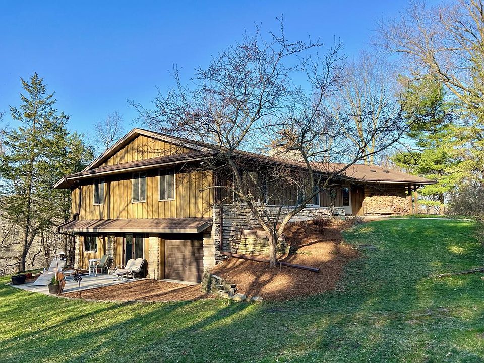 Carefully placed atop a picturesque ridge overlooking landscapes sculpted by ancient glaciers, this Ray Prell designed mid-century-modern ranch offers respite within nature's grandeur. Thoughtful design with generous south-facing windows, it invites views of surrounding forest and pond below while embracing principles of passive solar design. Natural materials inside and out incl. flagstone & cypress. Vaulted ceilings and exposed beams open the space, while fireplaces- one on each level- provide a warm focal point. Primary bedroom suite includes full BA, WIC, versatile flex room. Altogether the 3 generously sized bedrooms and 3 baths allow privacy for everyone. Spacious walkout LL is perfect for entertaining. Secluded 5.9 acre lot is close to shopping (8 min)/Hwy 16. Arrowhead Schools!