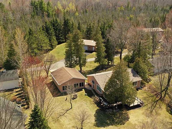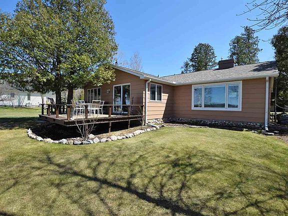Stunning Lake Noquebay views from most rooms in this spacious ranch home with 2 main living areas one with a woodburning fireplace open to the spacious kitchen. An oversized master suite boasts 2 closets. The garage space is not to be overlooked with 2 huge garages, one with a wall of windows facing the lake! The larger garage has a 10x 9 overhead door that will allow you to store most anything. Large 1.77 acre (per assessor) wooded lot! A year round home or second home retreat, it's up to you. Generous update list & drone video & photos available to better tell the story. Exterior-masonite