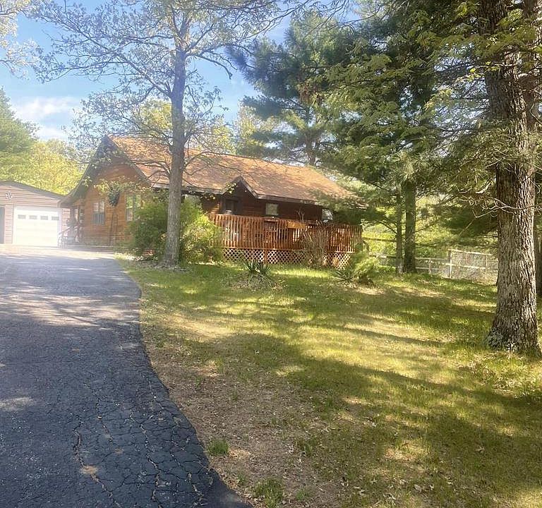 See our secluded single story 1,100+ square foot 3-bedroom log home on about 20 wooded acres which boasts a large 30' x 40' pole barn. The barn has a newly cemented floor and a newer professionally installed overhead door. The barn has been upgraded with a new 110 electrical panel and lighting installed since we moved in. We also built a 2-car detached garage with cement floor right near the house since moving here in 2016A huge well-like structure is the centerpiece of our park-like yard, which creates a wonderful display for any type of flowers that may be planted to surround it and which also may cascade out of the top if you choose. The great room is an open concept with cathedral wood-paneled ceilings have two nice skylights which help to brighten the space Kitchen/Living Room.