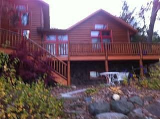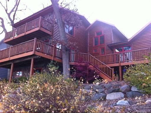 75 ft. of lake frontage on Pleasant Lake just outside of Elkhorn. A short trip to the IL border and a quick trip to Milwaukee. Enjoy the views from your living room, kitchen & master bedroom This chalet log sided home has large decks to enjoy the views, outdoor fireplace and waterfalls. Inside you have wood plank floors, great room with fireplace, gourmet kitchen with upscale appliances, master with fireplace.