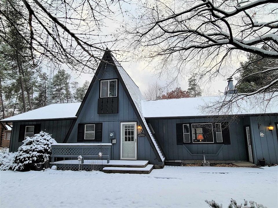 Large A-Frame house w/ 2 additions. It features 3 bedrooms & 2 full baths. Main level has large living room w/ wood fireplace, nice size dining area, kitchen, primary bedroom, primary bath w/ laundry area & walk in closet. The spiral staircase leads to upper level w/ 2 smaller bedrooms & small loft/sitting area. There is 21x21 garage w/ opener, 12x12 Gazebo and 10x10 garden shed. Large 15x15 back deck overlooking the backyard. Property is serviced by natural gas. Just shy of 1/2 acre of land. Walking distance to common pond w/ sandy beach, valley ball court & picnic pavilion. On ATV route & close to snowmobile trail. Castle Rock Lake sandy beach & boat launch less than 3 miles away. Yellow River less than 1.5 miles away. This property makes great vacation get away or full time residence.
