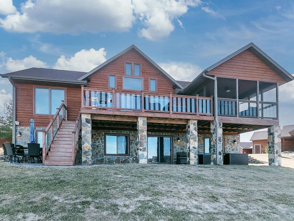 "Up North" decorated, move-in ready and fully furnished Lake Home, located on a premier cul-de-sac with 130' frontage on Island Lake "South." 3,080 sq. ft, 5 bedrooms, 3 baths, with extensive landscaping and so much more. Every imaginable upgrade including wood on ceiling and walls for that "Up North" vibe, 2-way stone gas fireplace in great room and master bed, screened-in porch overlooking the lake, stamped concrete patio underneath deck and stone pillars, entertainer's dream lower level with huge wet bar and another stone gas fireplace. Start enjoying "lake life" right away! ATV/UTV/snowmobile trails nearby for year-round fun in this recreational paradise. Access to Clubhouse with indoor pool, workout facility, pickleball courts and more - and access to a boat slip on Castle Rock Lake!