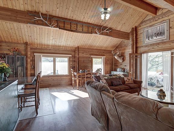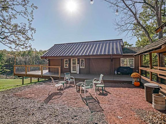 WOW! What a place! A short 35 minute drive southwest of Madison through the rolling hills of Dane and Green county you will find this little piece heaven nestled in the trees. A true wildlife retreat with mature woods, a meandering creek and pasture grazing like no other. This cozy 2 bedroom, 2 bath home has a phenomenal wrap around deck, tall vaulted ceilings and a redone kitchen enough to make you drool! The primary bedroom features a large walk in closet, fireplace and walk out patio doors. "Other" room listed is finished pantry. PLUS components to HEAT 42x63 Wick building with tons of opportunities including a heated and a/c office space. The covered walkway from house to shop is unique with its cedar shake roof and pathway. All of this and so much more make this property a must see!