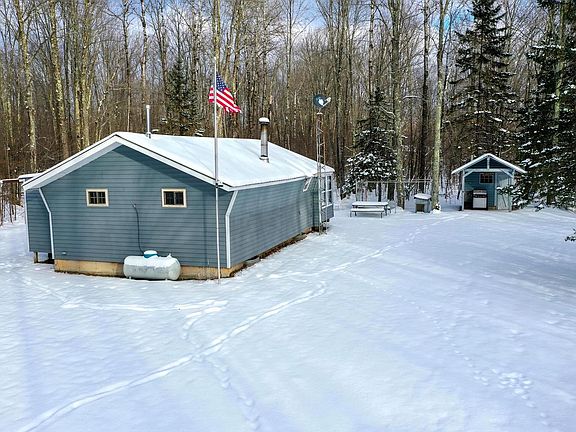 Furnished hunting cabin with a direct border on the Nicolet-Chequamegon National Forest. Located at the end of a dead-end road with gated driveway. Mature hardwoods and trail system leading through the +/-3.66 acres. Large yard with campfire pit and wood fired sauna. Great room with wood burning fireplace. Open concept kitchen with access to covered porch. Two-bedroom areas. Indoor shower room. Forced air lp furnace. Drilled well and electricity. 16x8 storage shed. Privy with electricity. Maintenance free vinyl siding and metal roof. Located on the utv/atv route and close to Jump River and Mondeaux Flowage. The refrigerator, range, dryer, wood stove, storage shed, window ac unit, tv, dog kennel, grill and cabin furnishings are included in the sale price.
