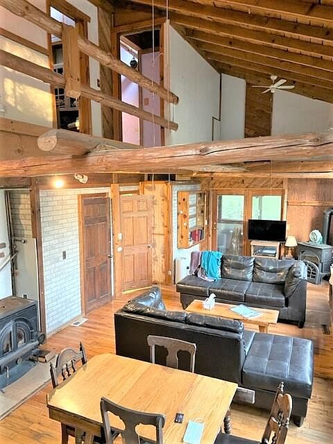 Outdoor Paradise! Do you love Nature and the Outdoors? If so this property is PERFECT for you ! Heavily wooded lot surrounds this unique property. Main floor boasts Kitchen, Dinette, Great Room, Full Bath, Bedroom and two enclosed porches. Upper Level has full bath and 2 more bedrooms. 2 Wood burning stoves in s the great room. Property has Solar Panels offering lower utility bills.
