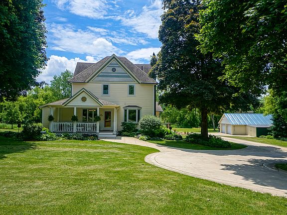 Charming updated Victorian Farmhouse set on 3 gorgeous acres! Welcoming front porch invites you to relax. Interior offers open concept floor plan, 9' ceilings w/ hardwood floors & crown moldings. Kitchen boasts granite island, SS appliances, & walk-in pantry. Living room features gas fireplace. Office has vaulted ceiling & built-in work space. Large main floor laundry room. Flexible floor plan could be used as a first floor mother in law quarters with separate side entrance, bedroom, 3/4 bath, laundry and kitchen or added space. 3 bedrooms and 2 full baths on upper level including the master suite with beautifully renovated master bath. Outside there is a 4-5 car detached garage with lean-to shed attached. Private 3 acre setting. Attention to detail throughout to property.