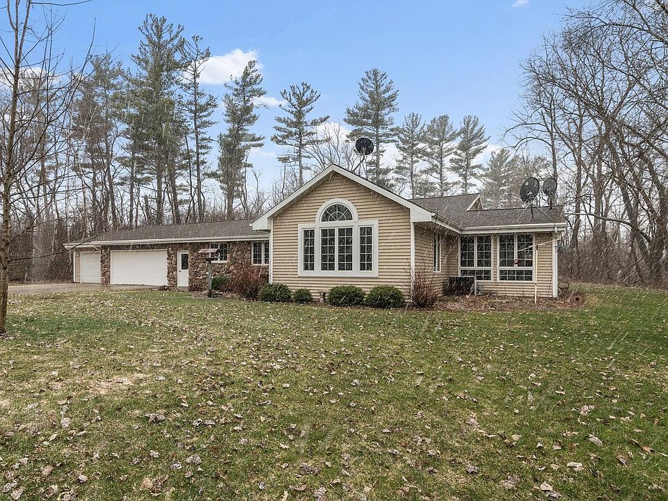 Charming 3BR/2BA tri-level on 3.47 ac! Set on a beautiful partially wooded lot minutes from amenities, this home greets w/ cathedral ceilings, french doors, and a fully-equipped kitchen w/ pantry. 4-Season room & fml living room w/ large windows overlooking the natural scene. Sliding door in 4S room opens to patio & back-yard w/ gazebo. Mudroom at entry to 3+ stall attached garage w/ bsmt access. Upper level overlooks main floor and contains all bedrooms & full bath. LL offers a cozy recroom w/ natural stone gas FP, laundry room w/ included washer+dryer, and 2nd bathroom.