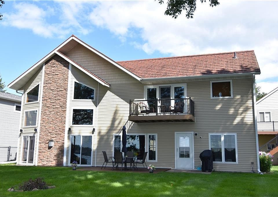 Stunning property with 100 feet of low bank frontage on Island Lake, part of the gorgeous Island Chain of Lakes. The five bedroom home plus 520 square foot, three bedroom guesthouse is a rare find, offering space for large families and groups to comfortably spend time on this beautiful lake. Spacious primary suite with balcony overlooking the lake, sauna, game room on upper level, large kitchen and dining area, a wall of lakeside windows, and a fantastic approach to the waters edge with no stairs. The level, West facing lot leads to rip rapped shoreline with sandy, hard bottom frontage. Large dock system with plenty of options for boats. This property is very easy to access and provides fantastic big lake views. This four lake chain offers seemingly endless scenic shoreline, excellent fishing, swimming and boating with great stops on the lake for a beverage or dinner. Located just 2 hours East of Twin Cities and 45 min North of Eau Claire.