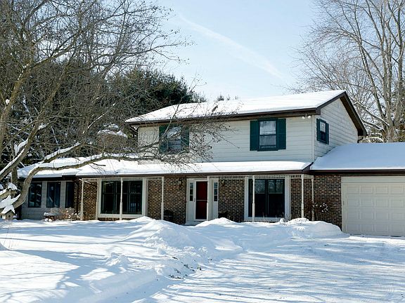 Comfortable colonial situated on a gentle rise among mature evergreens just west of Elegant Farmer and Lake Beulah. Open concept design from the large Great Room with natural fireplace to the kitchen with dinette, hardwood floors and appliances included. The tiled sun room addition offers sweeping views of the 5 acre partially wooded lot. Entertain with ease in the screen porch out back or the formal dining room with hardwood floors. Great layout for a large gathering! Upstairs you'll find a large master bedroom with WIC, 2 additional bedrooms and a full bath with jetted tub. The lower level offers plenty of storage and finished rec space. Bring the toys-the 40x30 outbuilding is sure to please! Quick commute into Mukwonago and I-43 access!