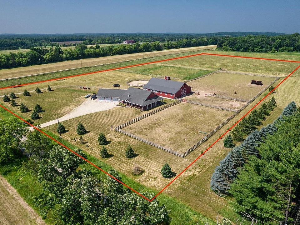Horse Lovers this Property is for You! Indoor/Outdoor Riding Arenas for use All Year Round. So much Country Charm throughout this ranch style home with full basement & outbuilding with heated party room, half bath, and animal washing station. Tack Room, Hay Storage, & 2 Stalls inside the Arena. Watch magical nightly sunsets on the patio between arena & fenced in pasture/riding areas. Was an Equestrian Therapy Facility at one time. Executive Style Home with 5 Bedrooms & 3 Full Bathrooms. Nice Sized Attached 3 Car+ Garage in Addition to Arena Storage. Open Concept Kitchen/Dining/Living Rooms with gorgeous Quartz countertops & island top. 2 Mudrooms are very handy. Front Porch to Relax On which wraps around to back BBQ Patio Space! Enjoy Quiet Country Living on just over 10 Acres! Call Now!