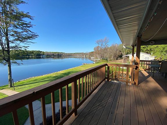 Custom built ranch style Year-round home on Crystal Lake . Offering 140 lin.ft. of frontage. Offering 3 BR's, 2 full baths, Walk out Lower level family room w/mini kitchenette & wood burning FP. Spacious raised deck overlooking the lake with Spectacular views. Attached 24x24 garage PLUS detached 28x40 garage & garden Shed. Private well & conventional septic all on 1.073 acres. Crystal Lake is great For water skiing, fishing & ice fishing. Close to snowmobile & ATV/UTV trail system.