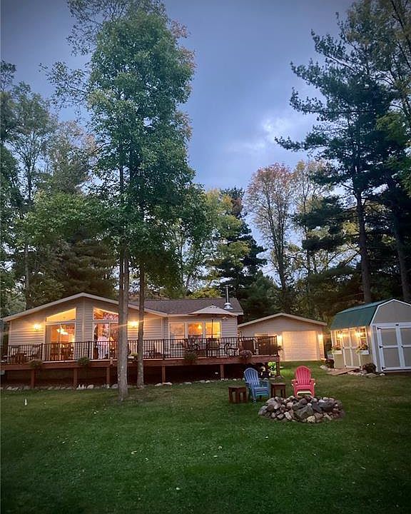 Beautiful lake home on the Island Chain of Lakes, a four-lake system with crystal clear water. This west facing home allows you to enjoy stunning sunsets and breathtaking views. The desirable low bank water frontage leads to a hard sandy bottom great for swimming and water recreation. The meticulously cared for home features floor to ceiling windows, new stainless steel appliances, main level laundry, master bedroom suite with private bathroom and walk in closet along with tasteful finishes throughout. The living area is complimented with a wood stove to help warm up after a day on the lake or an afternoon of ice fishing out your front door. There is a 28x20 detached 2 car garage for your vehicles and additional shed to store all your recreational items. Invisible dog fence installed. Home warranty offered. Located just 2 hours East of the Twin Cities and 45 min North of Eau Claire.