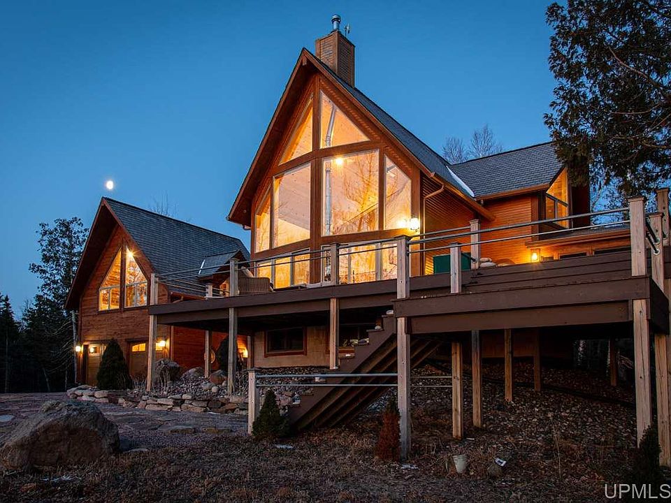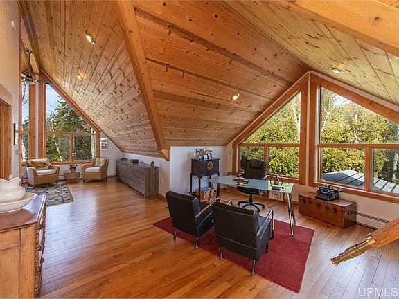 Coastal living at its best! Beautiful rustic/contemporary home, custom built on Lake Superior. With over 450 feet of gorgeous lake frontage on 5 acres, you'll enjoy happy hours on the water and entertaining on the expansive deck! Excellent snorkeling, kayaking, and stand-up paddle boarding on the calm, crystal-clear bay waters. This executive home is tucked in a beautiful bay with vistas of three peninsulas. Inside you'll find this three bedroom and two bath could be a five+ bedroom home with little effort. Home comes furnished. This custom home boasts radiant flooring, hardwood floors and stainless steel commercial-grade kitchen. Custom stone slate throughout both bathrooms. RAIS Swedish wood burning, soapstone fireplace. Back TV room could be converted to two bedrooms. Basement could also be converted to two bedrooms. New upgraded solar energy system provides up to 6000 kWh of power providing ample power and comfort to the home. Still under 25 year warranty. Now, let's turn to the guest cottage over the oversize, two car garage - allows the perfect guest suite for family and friends. Home comes with full video surveillance system. Short, daily flights from Detroit and Chicago make this a perfect escape from city life for you and your family. OR - Great income potential for investors looking for rental income!