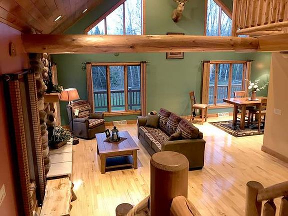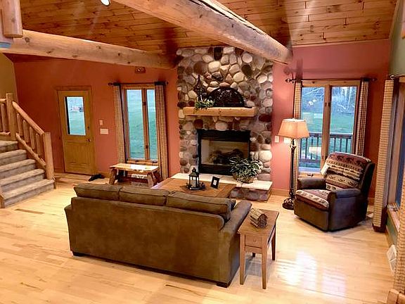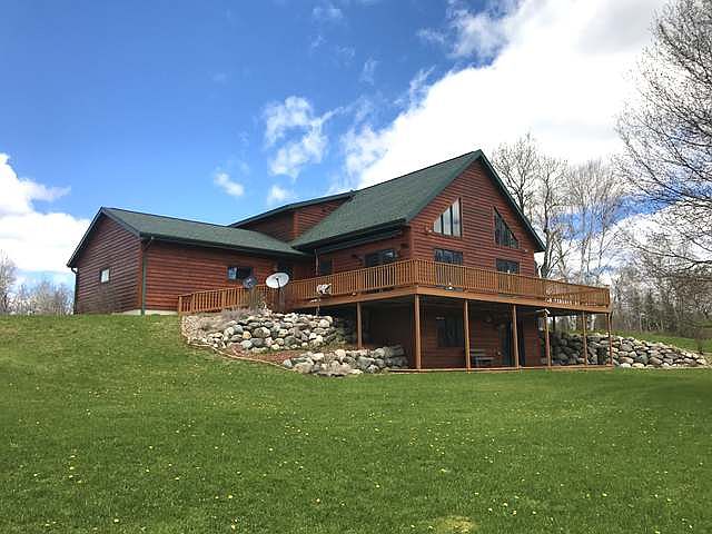 HARRISON HOME - Located on over 9 acres, this country home boasts large windows and cathedral ceilings, hickory floors, log beams, a stone fireplace, & a massive wraparound deck. Enjoy the great outdoors, with patio doors leading from the dining room, and a Sunsetter awning adding to the comfort. The main floor master bedroom has a walk-in cedar closet, while the main bath has a deep soaking tub. The loft has a lovely seating area, a full bathroom, & a bedroom with a private balcony. Downstairs, the walkout basement has been nicely finished w/pine ceilings, cedar walls, a pellet stove, and a hot tub. And let's not forget about the awesome backyard views! For your storage needs, there is an attached and heated 2-car garage, plus a 30x40 pole building with 200-amp service, a 10' overhang, and 2 overhead doors. Central air, a paved driveway, and satellite & stereo wiring inside and out sweeten the deal. Professionally staged home, with furnishings that could be purchased separately.