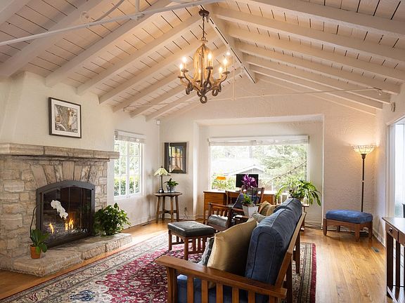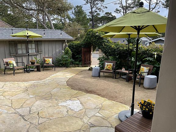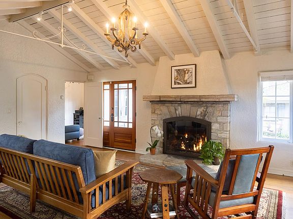 Enjoy gorgeous sunsets from this charming, single level Carmel cottage! The home features 3 bedrooms, 2 bathrooms, and blue ocean views from the dining room and primary bedroom. Enter the large courtyard through a vine covered archway and follow the path to this enchanting cottage. A stone fireplace, hardwood floors and soaring ceiling grace the living room. An updated kitchen and attached dining area provide wonderful space for gathering. The primary bedroom is separated from two additional bedrooms, one with its own exterior entry. A detached single car garage and utility room enhance this great property. Enjoy a quiet neighborhood with easy access to downtown and the beach. Come see this special home!
