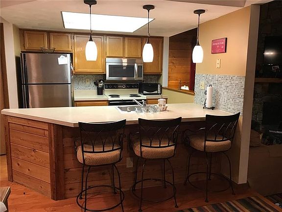 Nice touches to this end-unit townhome in the very popular Arosa floor plan. The floor plan features a bedroom and full bath on the first floor, which have been remodeled. The beautiful stone, wood-burning fireplace is the focal point of the living room. Off of living room is a deck to enjoy the outdoors. Close to shuttle stop, which runs year-round. Owners have access to a summer recreation area with swimming pool and tennis courts.