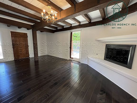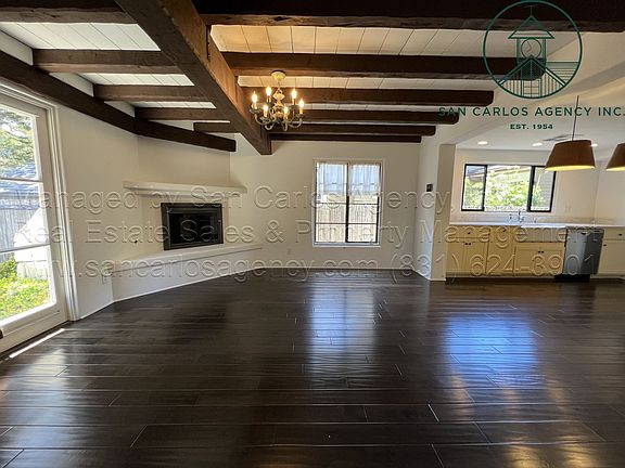 (HUANC) San Carlos Agency, Inc. offers this nicely updated and immaculate Spanish Colonial style, three bed, three bath home in the heart of the "Golden Rectangle" just steps from renowned Carmel Beach. Enter into a great room with hardwood floors and gas assist fireplace that opens to the spacious kitchen. The kitchen has marble counters, white wood cabinetry, stainless steel appliances, including LG refrigerator, Viking gas range, Bosch dishwasher and disposal. There is a guest bedroom downstairs with hardwood floors. Downstairs also has a full bath (shower only) and tile floors. Additionally, there is one of two bonus rooms between the entry and the downstairs guest bath. The laundry room offers a stacked washer/dryer (left as a courtesy to tenant) and adjacent laundry sink. There is a secondary and spacious family room upstairs with hardwood floors, vaulted, open beam ceilings, gas assist fireplace, and a peek of the ocean. The primary bedroom is also upstairs and offers vaulted, open beam ceilings. The primary bath has a tub/shower combination, tile floors, and walk-in closet. Adjacent to the master is the second bonus room/office with built-in cabinetry. The second guest bedroom rounds out the upstairs area and features open beam ceilings, hardwood floors and views of Carmel Bay. The upstairs guest bathroom has tile floors and a shower stall. A spacious two car attached garage. Fully fenced and landscaped front yard with new turf installed. Tenant pays all standard utilities and will maintain the yard and grounds at their expense. Pet negotiable. No smoking.