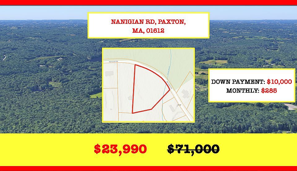 2.42 Acres in Paxton, MA - Only 60 Mins to BOSTON - Corner plot with many possibilities - Assessed at $71,000 - BUY TODAY FOR $23,990!! Note: We sell real estate at discount wholesale prices! This beautiful corner property is located in the town of Paxton. Only 20 minutes to Worcester and 60 minutes to Boston, they have perfect connections in all directions. 400 ft frontage and the "Caruth Brook" Creek that runs across the property are just two of many highlights of this lot. Located directly at the "Moore State Park" this property offers you beautiful nature. Build your own home or a vacation home. Maybe you use this lot for your hobby or other amusements. It is up to you what you do with this beautiful lot. Buy this property today for just $23,990 Interested? Call or txt Living Enterprise, Inc. Property Type: Land Sale Price: $23,990 State: MA County: Worcester APN (Assessor's Parcel Number): PAXT-000005-000000-000002U Property Address: NANIGIAN RD (42.316897, -71.971483) City: PAXTON Zip: 01612 Size: 2.42 Acre(s) Zoning: 0R4 Road Access: Yes - Paved Electricity: Within 1 mile Annual Taxes: $1,397 Market Value: Similar lots in the area are selling for $71,000. Get this property now for $47,010 below market value... Own it today for just $23,990 To buy this property at this discount price call or txt Living Enterprise, Inc.