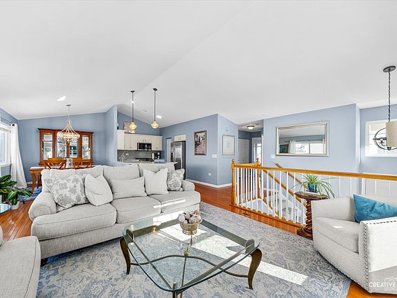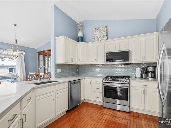 HELLO GEORGEOUS! The only townhouse currently available in Tall Grass and the most updated one you've ever seen. This rare end-unit stuns from top to bottom with thoughtful, high-quality upgrades and impeccable style throughout. The kitchen has been completely transformed: refinished white cabinetry, a formerly two-tiered countertop re-imagined into a single expansive surface, and finished with sleek quartz countertops & single deep basin sink. Stainless steel appliances include a vented microwave (2025), oven (2022), and a whisper-quiet Bosch dishwasher (2019). A gray glass subway tile backsplash and brushed-nickel 5" drawer pulls complete the clean, modern look. Hardwood floors span the main level and lower level (excluding bedrooms), while brand-new plush carpeting enhances the primary bedroom, staircase, and third bedroom. The dining room shines with a striking crystal chandelier-perfect for both everyday living and entertaining. Rarely do both the living room and family room feature Heatilator fireplaces, but this home offers two-each elevated with white shaker-style mantels and custom molding that reflect the sellers' exceptional taste. Wait until you see the primary retreat. Vaulted ceilings, brand-new plush carpet, and a generously sized walk-in closet outfitted with Elfa organization and drawers set the stage. The ensuite bath is a true showstopper-completely gutted and reimagined with a custom vanity topped in quartz, Kohler fixtures, new mirrors and lighting, new tile floors, a frameless glass shower with thermostatic valve, with both a shower head and handheld sprayer and a charming freestanding tub beneath a crystal chandelier. The piece de resistance? A Toto heated-seat bidet toilet-luxury at its finest. The second bedroom offers flexibility with a pull-down Murphy bed, newly added closet, and is currently used as a home office-ideal for guests or work-from-home living. The lower level features a cozy family room with hardwood floors, sliding glass doors, and a second fireplace. The third bedroom boasts brand-new carpet and a large walk-in closet. A convenient laundry room includes a stackable washer and dryer. The finished basement adds even more living space with ultra-plush carpeting, a dedicated media area for movie nights, and a recreation space ready for fun and relaxation. Tall Grass is a swim/tennis community. Nearby is Amazon Fresh, LA fitness & Route 59 shopping & restaurants. Award winning district 204 attendance.