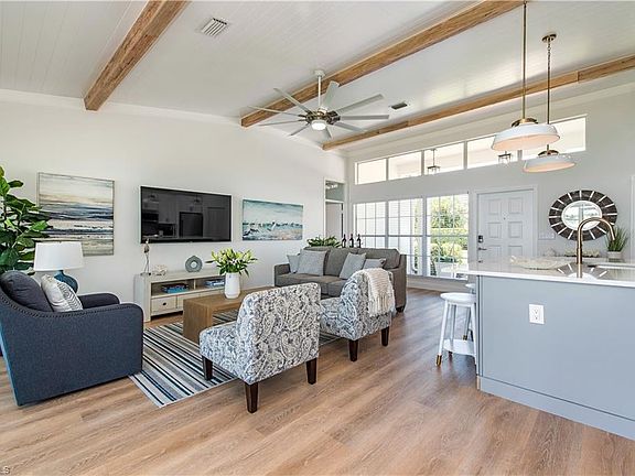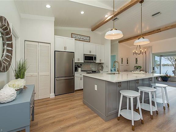 availableDECEMBER AND JANUARY!. One of our most popular rentals, you can escape the cold and enjoy a front-row seat on the largest natural spring-fed lake in Naples, with magnificent colors mirrored in the water and a peaceful, quiet location. A screened-in lanai has outdoor dining and a sectional seating area to gather and relax while you have your morning coffee or cocktails by the water. This home has a split floorplan with a vaulted great room and a privately located owner's suite (king bed) with great lake views, high volume ceiling, spacious walk-in closet & remodeled bathroom with Euro-glass shower, soaking tub, double vanity, and large mirror. Two guest bedrooms (queen in one, two twins in the other) share a bath with a walk-in shower, modern vanity, and abundant lighting. The kitchen has a large island with quartz counters and bar seating, stainless appliances, and an eat-in kitchen. Vaulted shiplap paneled & beamed ceilings give a light and airy look throughout. The home is turn-key furnished and fully provisioned...including bikes, beach towels, cooler, beach chairs, tennis and pickle ball racquets, and everything you need to enjoy paradise in Naples. Emerald Lakes is quiet and private, yet literally in the middle of everything you could ever want, with friendly residents and amenities such as a community pool, night-lit tennis and pickleball courts, bocce ball, fitness room, and fishing pier. So grab it now! Just 12 min. from beaches and 6 min. from Mercato. DOG ALLOWED, with approval and an additional pet deposit. ALL UTILITIES ARE INCLUDED!