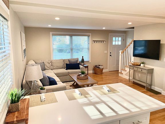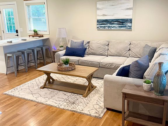 A newly remodeled Cape-style house located a short walk to The Narrow River in Narragansett, RI. The house features two floors with 3 bedrooms, 2 full baths and also an unfinished basement with a bulkhead. The house has an open floor plan with a fully-equipped kitchen with an eat-in peninsula island which opens to a living room. The house is equipped with central air conditioning and gas forced heat.