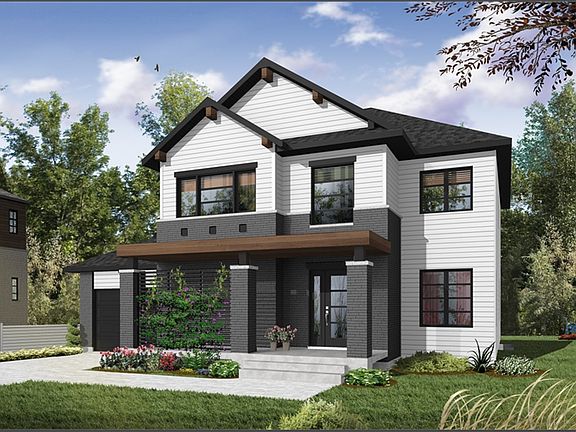 This 2038 square foot modern style house plan features a beautiful open floor plan that includes a kitchen that is perfect for cooking and entertaining. The spacious dining room will be a stunning area for your family events as well as an elegant living room with fireplace. The second story includes 4 bedrooms and 2 full bathrooms. The master suite has a large walk-in closet and bathroom with double vanity and large shower enclosure. The three other nicely sized bedrooms share a full bathroom with double vanity. The garage has enough space to include a workshop or storage space. With distinctive details like the uniquely styled covered veranda in the front and a large terrace in the back these areas are sure to become your favorite places in the warmer months.