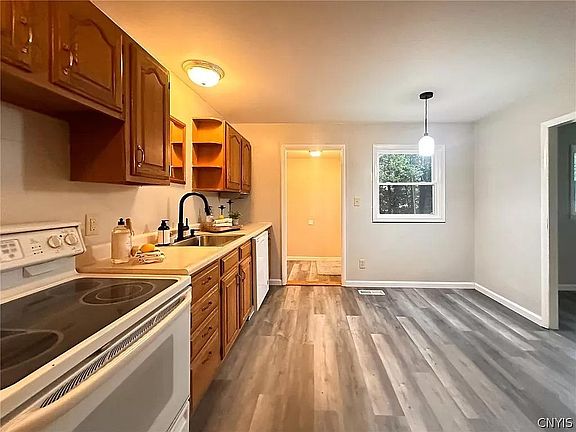 New Hartford Ranch 3 (or 4) bedrooms, 1 1/2 baths, living room, family room, extra-large eat-in kitchen, entire house has new flooring and paint throughout, two new bathrooms, new furnace, new hot water tank and dishwasher, Desirable and convenient neighborhood. New Hartford School District, Elementary children can walk to school and the playground.