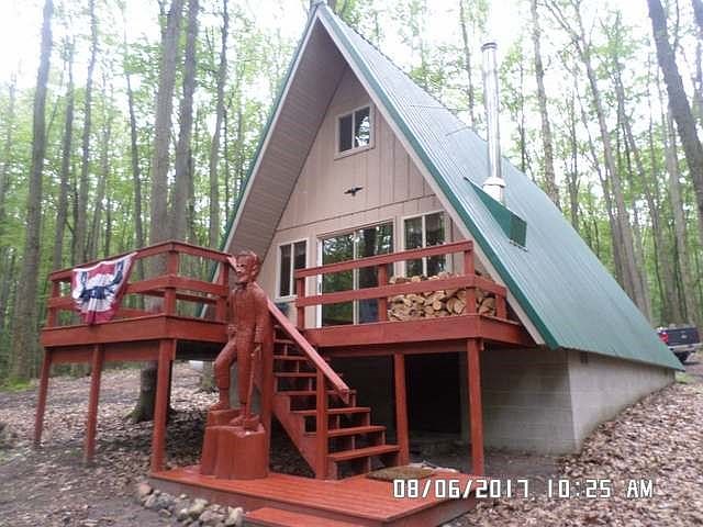 Once in a Blue Moon does this come along! Beautiful rolling,wooded land with mature trees, manicured trails and property line markers. 4bd 1 ba A-Frame with nature wood interior, fireplace and electric or gas lights. Owned propane tank. 12x12 heated elevated deer blind overlooking apple trees. 3rd 10 acres is just down trail for another great spot complete with trails and markers.