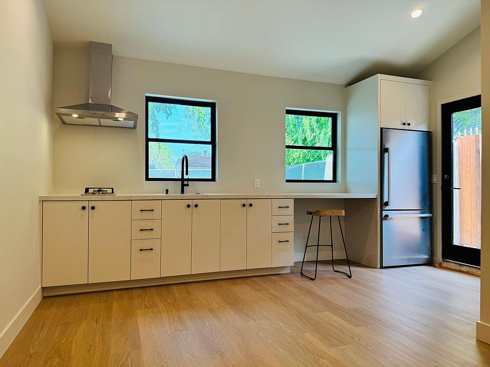 Like new construction! It is currently semi -furnished but we are open to changing it up if desired! Some of the photos are a bit dated (will add more soon) and a wardrobe / closet was added. It has its own private entrance and exit. Includes a washer / dryer, full refrigerator, stove top and lots of storage! It also has AC and heating. Super fast Wi-Fi as well! Window coverings have been installed.