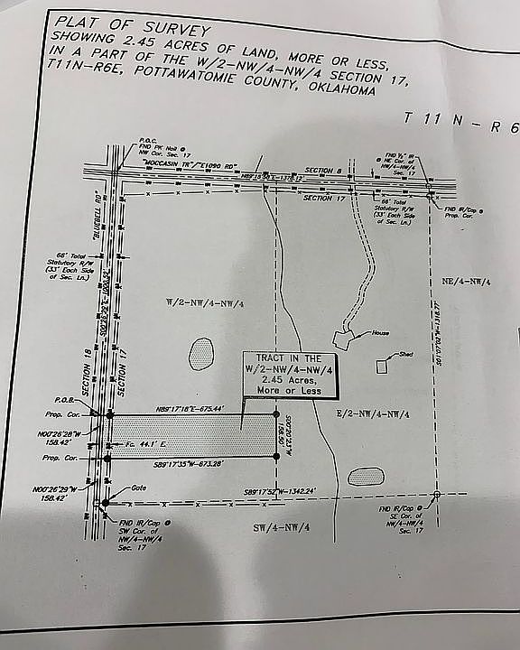 2.5 acres of vacant land lot 7 right off of moccasin trail a paved road and Ns 3540 rd this lot is 11 miles east of shawnee and four miles south of Prague and 3 miles north of I 40 no homes smaller than 1600 sq ft and no mobile homes cvec is electricity provider and great well water in area 54191 moccasin trail Prague ok 74864 my cell 405 567 9097