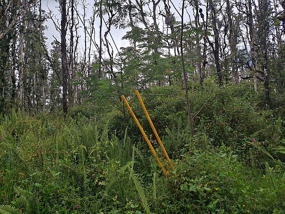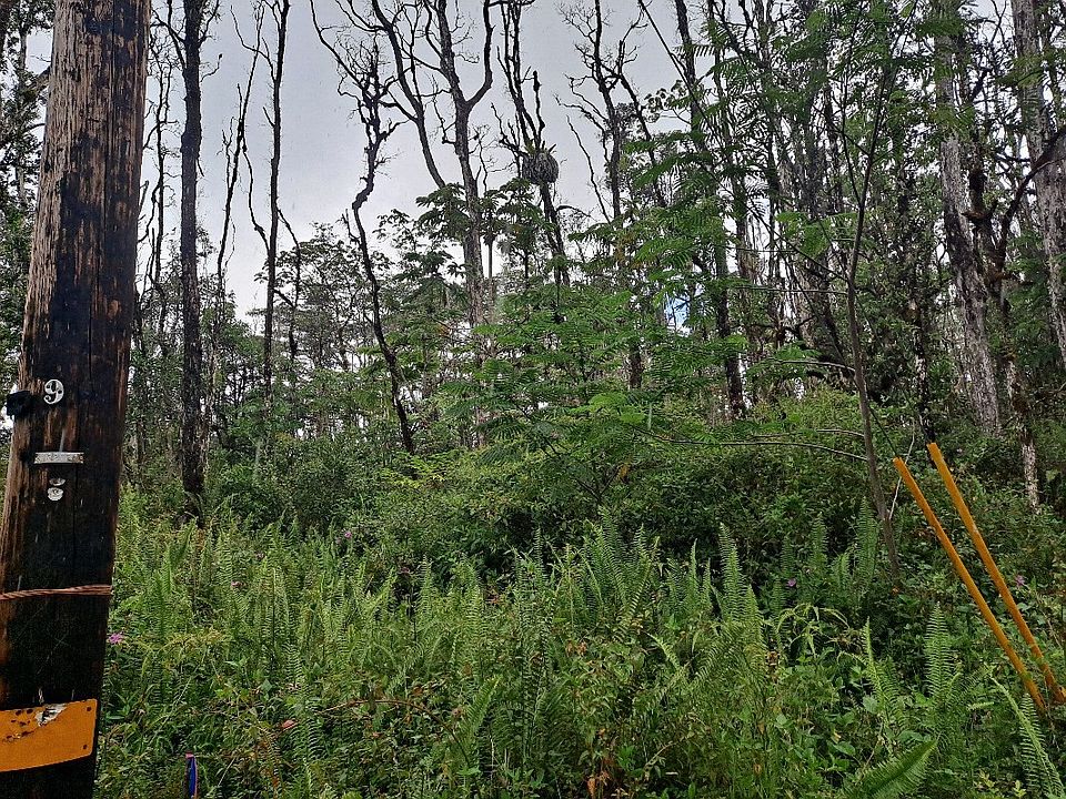 This lot sits higher than most of Nanawale because it is part of an older kipuka. Ancient ohias stud the lot but have succumbed to ROD. Their use could be garden beds or posts as this is some of the hardest wood you will find. A driveway was put in previously, since overgrown, but with some clearing can be used again. Power is at the road. On a quiet street. Drive by and see. Front left pin is marked with blue and pink flagging just behind the power pole.