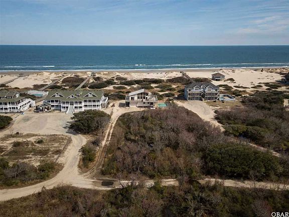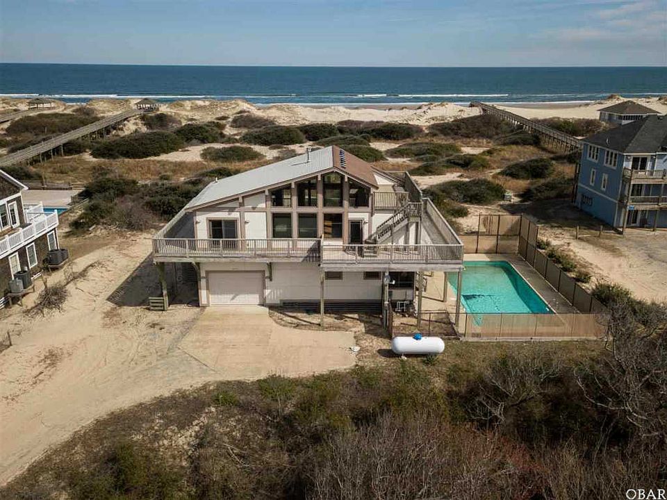 A rare opportunity to own a coastal cottage on 3.35 acres with 146' of ocean frontage. This unique location is in the 4wd area of Corolla, where the wild horses roam. The two-story home features beamed cathedral ceilings, walls of windows, hardwood floors, large kitchen with stainless steel appliances, fireplace, garage and a large heated salt water pool. A crow's nest top deck showcases amazing views of the ocean, the sound, historic Penny's Hill and even the Corolla lighthouse. There's a steam room and a sauna on the ground level, along with an open room, a full bathroom, a laundry space and a door that opens to the screened porch and pool area. Stairs take you to the top level that is one big open-concept area, with kitchen, living space and space that the owner used as a bedroom. There are his and hers closets, and his and hers full bathrooms on this level. There's also a dumb-waiter from this level to the ground level, for laundry/groceries/etc. Ample ocean-facing and sound-facing decking provides so many views and ways for outdoor living and entertaining! Open the windows and doors and let the salt breeze flow through. This is a truly unique property that allows you to experience the beauty of the Outer Banks in a peaceful setting. Approximately a mile from the paved access road. X-flood zone, so flood insurance is not required! 43K BELOW TAX VALUE!