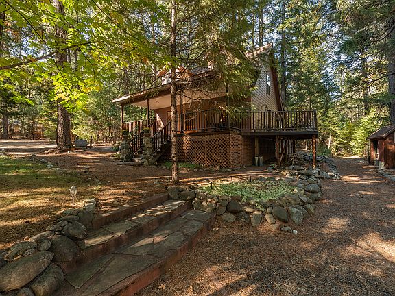 Well appointed cabin, minutes from Trinity Lake. Covered front & back porch that are made of Redwood decking and Mahogany railings, leading to open living area with white washed knotty pine finish on the ceilings Cedar wainscotting, fossilized fern tiled finish for the wood stove platform & Douglas Fir flooring, Dining room is well lit with large bay window & features bench seating. Kitchen offers a breakfast bar area & counter tops of Zodiaq quartz counters, updated appliances, under cabinet lighting & a door to back deck for outdoor entertaining. There are two bedrooms on the main floor & an over sized bathroom/mudroom area with travertine stone flooring and counter tops, mudroom area comes with hook ups for the washer & access to the outside. Upstairs you will find a large loft sty