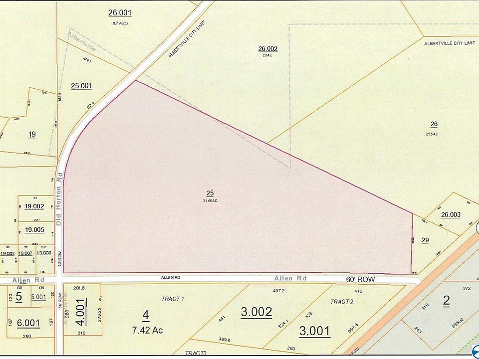 30+/- ACRES IN CITY LIMITS OF ALBERTVILLE. LOTS OF OPTIONS. 1200+/-FT OF ROAD FRONTAGE. FRONTS ALLEN RD & OLD HORTON RD. ADD'L 2 BR, 1 BA HOME & 1+/- ACRE CAN BE PURCHASED WITH ACREAGE FOR ADDITIONAL $55,000. CURENTLY RENTED AT $400 PER MONTH. **ALL INFO INCL SCHOOLS/ACREAGE TBV BY PCHSR**