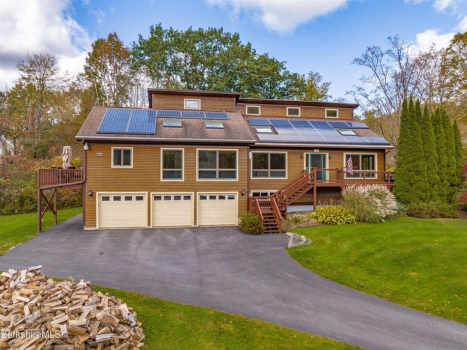 Expect to be impressed with this well maintained contemporary style custom log home situated on a beautiful .58 acre lot @ the base of the Mohawk Trail surrounded by SPECTACULAR MOUNTAIN VIEWS!! Property features: 4 bedrooms,4.5 bath, OVERSIZED 3 CAR GARAGE w/new doors, Eat-in kitchen w/breakfast bar & new kitchen appliances, VT cast iron wood stove in living room,Tesla solar panels=energy $ savings, Primary bedroom suite w/walk-in closet primary bath w/jetted soaking tub & walk-in shower, Part finished walk-out basement, newly paved driveway & RV parking station! Addition (2000) boasts primary bedroom suite w/full bath, 1st floor laundry, 2nd bedroom & custom kitchenette/bar area-could be great for multi generational? Close to Mass Moca, skiing, hiking & all THE BERKSHIRES has to offer!