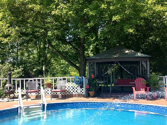 The main house is a converted 1860's barn/house that is 3000 square feet of finished house- 3 bedrooms . 2 1/2 baths, great room with vaulted ceilings and floor to ceiling stone fireplace with buck stove- office/ studio/ 35 X35 deck with pool and gazebo. The 1982 small brick guesthouse is 950 square feet with 2 bedrooms, 1 bath large kitchen,living room with cathedral ceiling and fireplace and wood stove, deck The property has a 7800 sq ft horse barn w/ 13 stalls and indoor arena- 250 sq ft block storage building- rolling fields, woods,pond and creek on 8 acres.