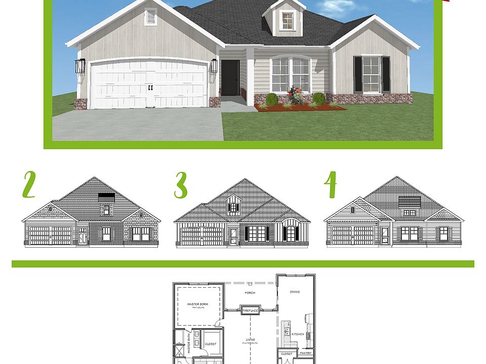 The Azalea is the perfect floor plan for a family who appreciates a one story, open layout. This four-bedroom, two-bath home showcases a large living room with a vaulted ceiling and gas fireplace. Immediately off the living room is the kitchen that connects to the dining room, complete with a breakfast bar, walk-in pantry, and ample cabinets and countertop space for preparation and entertaining. Two large windows allow for plenty of natural light, in addition to a 6' sliding glass door that leads to the covered porch. Three guest bedrooms and a full bathroom with double vanities are located down a dedicated hallway, providing extra privacy. The largest guest bedroom features another vaulted ceiling, making the room feel even more spacious. On the opposite side of the home is the private owner's suite, featuring a tray ceiling, double bowl vanity, soaking tub, and walk-in shower. The Azalea also features a laundry room with extra cabinetry and countertop space.