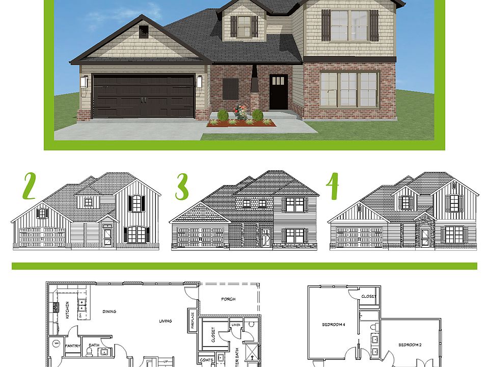 The Lily floor plan is a two-story home full of natural light. As you walk through the entryway, you are greeted by an open concept space that effortlessly connects the living room, dining area, and kitchen. The kitchen features a wrap-around island and walk-in pantry. The five large windows in the living space illuminate the home while providing a view to the backyard. Also on the first floor is the private owner's suite, featuring a private bathroom with a soaker tub, walk-in shower, linen closet, and double vanities, as well as a walk-in closet. Upstairs, you will find three guest bedrooms, the largest of which includes a vaulted ceiling for an added sense of space. Each bedroom has a sizeable walk-in closet and a shared full bath with double vanities.