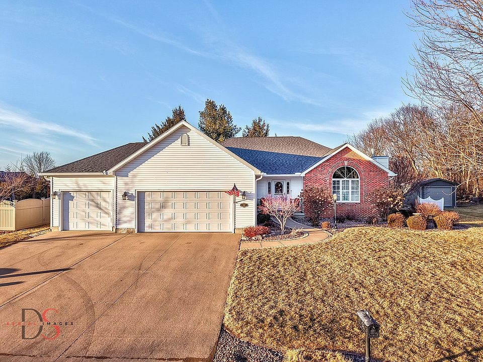 This Northside Ottawa 3-bedroom ranch combines spacious living with thoughtful functional upgrades. The open-concept living and dining area features vaulted ceilings and a cozy gas fireplace, flowing seamlessly into a kitchen finished with maple cabinetry with pull-out shelving and granite countertops. Bathed in natural light, the adjacent sunroom offers a serene retreat. The master suite serves as a private oasis with its elegant tray ceiling, expansive walk-in closet, and a walk-in tub installed in 2024. For additional living space, the lower level includes a family room, a full bath, and a versatile flex bonus room for office or recreation room. Practicality is a highlight of this home, featuring a three-car garage with direct basement access for easy moving and storage. The lower level also provides a dedicated workshop and abundant storage space including 8 shelving units. Outdoors, enjoy picturesque sunsets from the paver patio and beautifully landscaped yard. Roof and Velux skylights replaced 2017. House Generator and all Appliances are included, and seller will leave sunroom furniture (not table/chairs) and Amish electric fireplace as a gift. Stained glass in master bath and stained glass in living room will stay with new homeowner. Taylor Way prepaid by seller for fertilizing for upcoming year.
