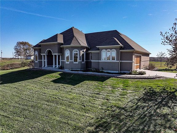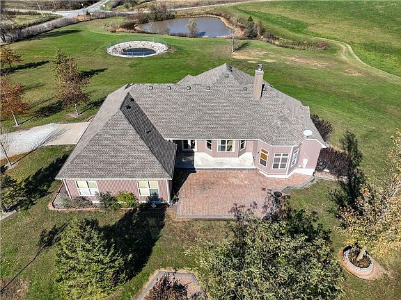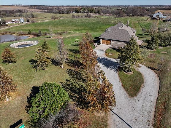 The perfect spot to enjoy the beautiful views of Platte County! This corner property offers so much - gorgeous outdoor living space, a fully-stocked fish pond, easy access on pavement, quick proximity to the interstate, and a fantastic house as well. Inside the stately double front doors you find a stunning stone fireplace with builtins, hardwood floors, and soaring windows. The kitchen boasts beautiful wood cabinets, stainless steel appliances, and a great island (washer and dryer convey with the property). There are three spacious bedrooms, closets galore, and a formal dining room. All of this and an enormous basement that gives you lots more storage plus the potential for any kind of additional living space, bedroom, office, play area, etc.