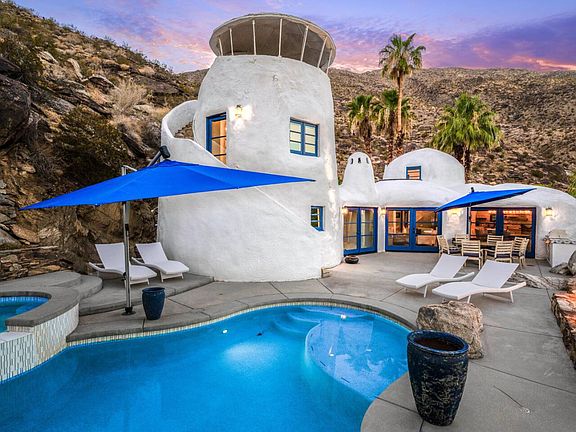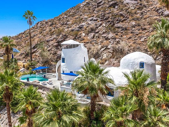 Enter through the majestic gates and up a 300' private driveway, to this secluded and very private ''Santorini Inspired'' estate that sits at the top of The Mesa in South Palm Springs. Sweeping panoramic views of the entire valley is only one of the many special highlights of this iconic Palm Springs estate. Originally designed and built by architect William Nicholson in 1977, the structure is a unique work of art. The property went thru a complete ''re-imagination'' and renovation 2018-2019. An abundance of natural elements were used in the renovation, including Curved plaster walls, softly domed ceilings, half-moon openings on the fireplaces, century old beams from a 120 yr old farmhouse, imported tiles from Greece including Thassos marble and white Agean limestone. Being offered ''turn-key furnished