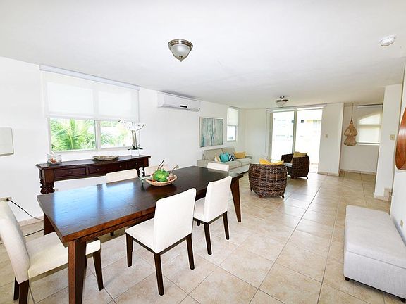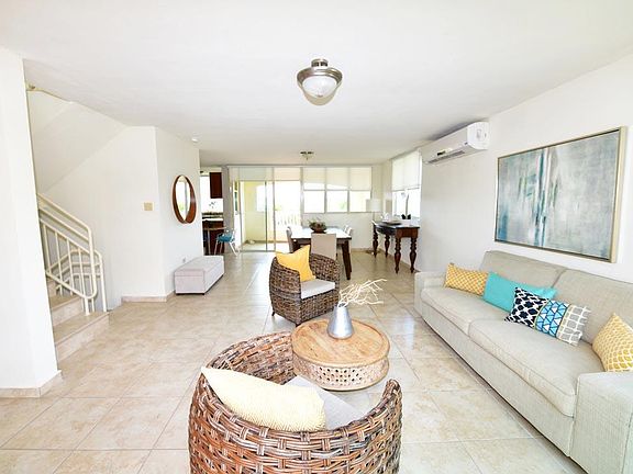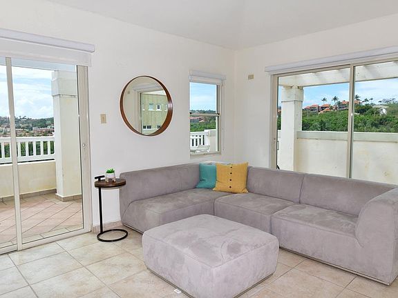 Beautiful corner penthouse at Palmanova Village. Multi- level - 3 bedroom, 3 bathroom, living room, dining room, kitchen, multiple balconies and wrap around terrace with mountain view and partial ocean view. Fully furnished and equipped. Controlled access. 2 parking spaces and 1 parking space for golf cart. Community Pool, Gym and small park for children. Walking distance to Palmanova Plaza and the beach. Long term rental requires first/last month plus security deposit. Utilities not included. Maintenance included.