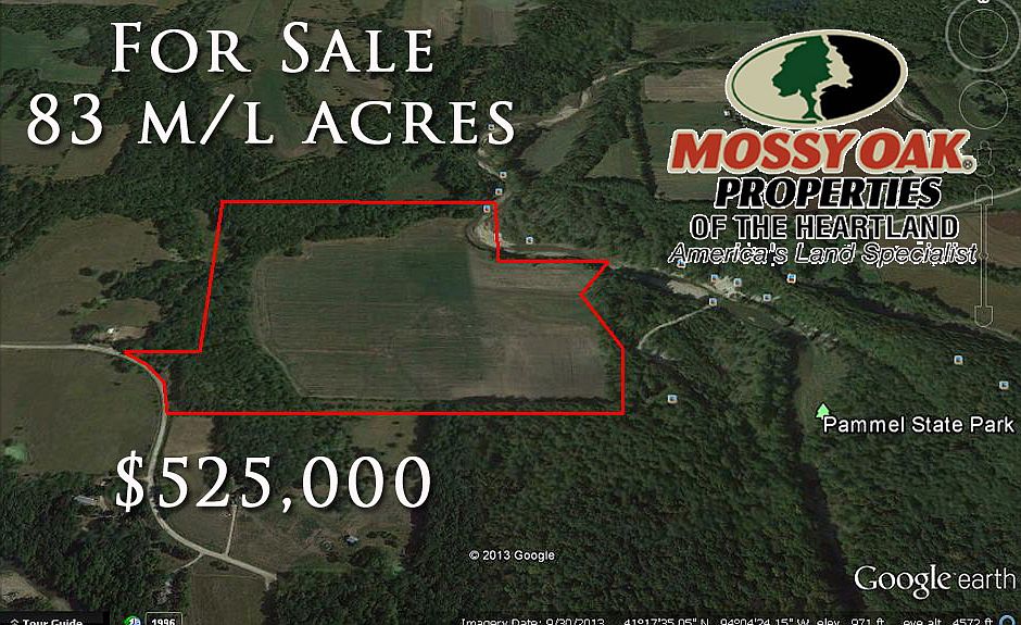 This 83 +/- acre tract for sale is a mix of high producing tillable, and recreational land. Positioned 30 minutes from Des Moines, this property borders Pammel State park, just 5 minutes SW of Winterset in Madison County Iowa on Pammel Park Road. A well maintained road and two entry routes make for easy access on this property. 56 +/- acres of row crop ground provides a great return with an average CSR of 67.4. The current owner has offered torent back the tillable acres for the 2014 crop season, but no contingency exists. The balance of non agricultural land is made up of mixed timberland, including some walnut and oak, The property's South and East boundary borders Pammel State Park Wildlife Refuge. Deer and Turkey are plentiful, and fishing is available in the Middle River which borders the North side of the property. This offers a great recreational resource which could be leased for additional ROI. Owner is offering land for sale as single tract or split in two tracts (Tract 1 - 27 +/- acres timber; Tract 2 - 56 +/- acres tillable).