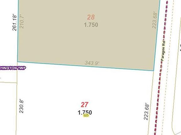 Total of 1.75 acres of land per county records. Located in Washington Township. Located on Paragon Road close to Social Row Road. Vacant lot. See photos for aerial view of lot and dimensions.