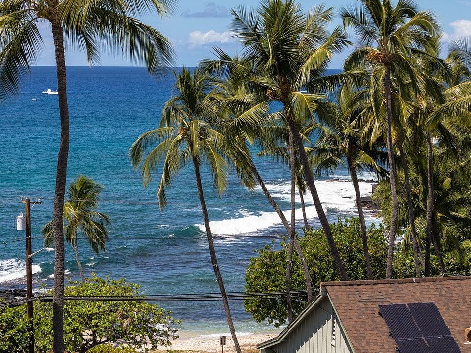 BEAUTIFULLY REMODELED PENTHOUSE OVERLOOKING THE BAY IN THE VILLAGE!!! If only PERFECTION will do, this is the condo for you! Located in the Heart of the Kailua-Kona Village, surrounded by restaurants and attractions; this 2 level Penthouse offers exceptional views of the Bay, Ocean, Hualalai and the Village. Upper floor, built out by a previous owner, created 458 sqft of living space plus a sizable top-of-the-town deck with spectacular ocean & mountain views. Downstairs is a huge great room, covered lanai, bedroom and 2 baths. Last year the current owner COMPLETELY remodeled the entire living area, selecting the latest high quality materials. NO SURFACE WAS LEFT UNTOUCHED. In 2018 these were installed: recessed lighting, new interior doors and trim work, glass shower stalls and tile surrounds, bath vanities/sinks/mirrors, full sized stack washer and self-venting dryer, redesigned kitchen cabinets have the rich look only wood gives, granite counter tops, travertine backsplash, pendant lights over the breakfast bar, new kitchen appliances, split system air conditioning, ceiling fans and custom window treatments. ALL the floors have the wood look vinyl plank flooring that is becoming the flooring of choice. It has a 50 year warranty (49 years left), wears like iron in wet and dry areas and gives the home a seamless look. Every stick of furniture and every item in this fully furnished condo was new in 2018. Each item was selected for its tropical visual appeal, quality and comfort. The lucky buyer will enjoy 3 big flat screen TVs, two recliners, a comfortable sofa, dining room furniture that seats 4, 2 well furnished lanais, two king sized beds and an assortment of furnishings and decorator items. Classic "Pan Am" Prints finish the Vintage Hawaiian look. One covered parking space and storage locker included with 711. AOAO includes water/sewer/trash/basic cable/hot water/exterior maintenance Seller is licensed HI real estate broker.