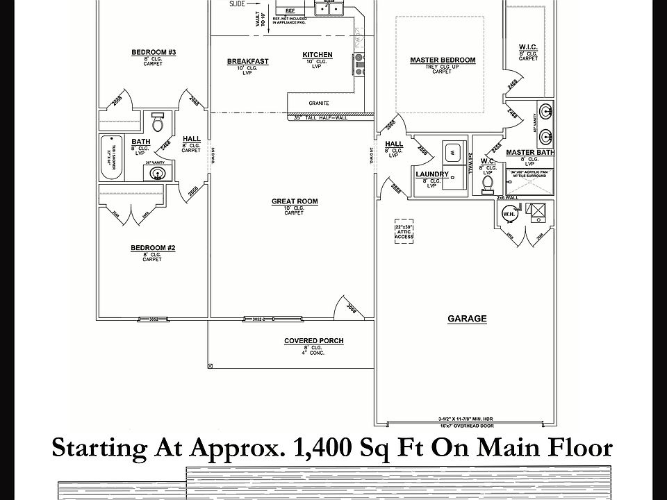 This 3 Bed/2 Bath home features a large covered front porch, spacious great room with 10' ceiling, open floor plan, and split bedrooms. The eat-in kitchen offers vaulted ceilings, stainless steel appliances, granite countertops, and roomy breakfast nook. Master suite offers an elegant trey ceiling, spacious walk-in closet, and master bath with double vanity, water closet, and large walk-in shower.The Winnipeg offers a basement option.*Floor plans subject to change. Our online floor plans are only intended to give a general indication of the proposed layout and amenities.*