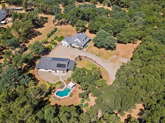 Picturesque modern ranch country home on 5 gorgeous sprawling acres with wrap around covered porches, pool, chicken coop, raised bed gardens, orchards, treehouse, 8 car garage and lots of room to roam. Enter through the private gated entrance into a perfect floor plan with numerous upgrades featuring beautifully updated kitchen with granite counters and stainless appliances overlooking breakfast nook, great room with wood burning river rock stone surround fireplace and spacious first floor primary suite with lavish bathroom and walk in closet. Upstairs loft or 4th bedroom and two additional bedroom suites with plenty of closet space. Attached 2 car garage with additional 6 plus detached 2400 sq ft shop with wood burning stove and full bath which could convert to ADU. Owned solar, owned propane, public water. Clear pest, new roof and HVAC. Minutes to HWY 50, restaurants and retail.