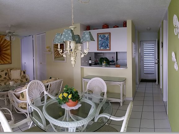 FULLY FURNISHED and COMPLETE - Move in Ready - 2 bed, 2 bath condominium, right on the Playa Azul / Luquillo Beach, 30 minutes East of San Juan Puerto Rico. 10th floor (perfect height for great views) , interior unit (less noise and wind) . Updated kitchen with full size updated appliances. Tile floors, recently painted. Living room / Dining room, full length balcony with stellar views. Full time security / doorman, secure parking. Well maintained building. Cable/ Internet wired. New full size washer / Dryer, full size ceramic top range and oven.